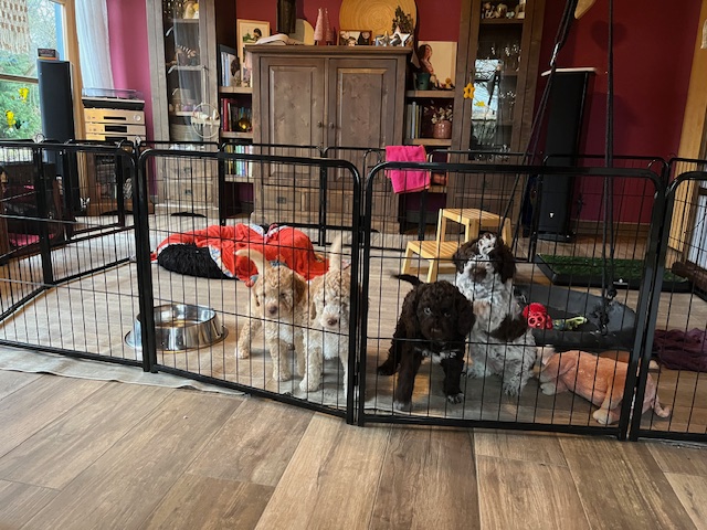 Inzwischen sind an Weihnachten 2025 alle Welpen ausgezogen und haben alle ein wunderschönes neues Zuhause gefunden. Sie lernen schnell und wickeln den ein oder anderen um den Finger. Wir freuen uns sehr, mit allen in Kontakt zu sein und planen für den Frühling ein Welpentreffen.